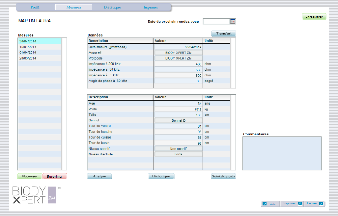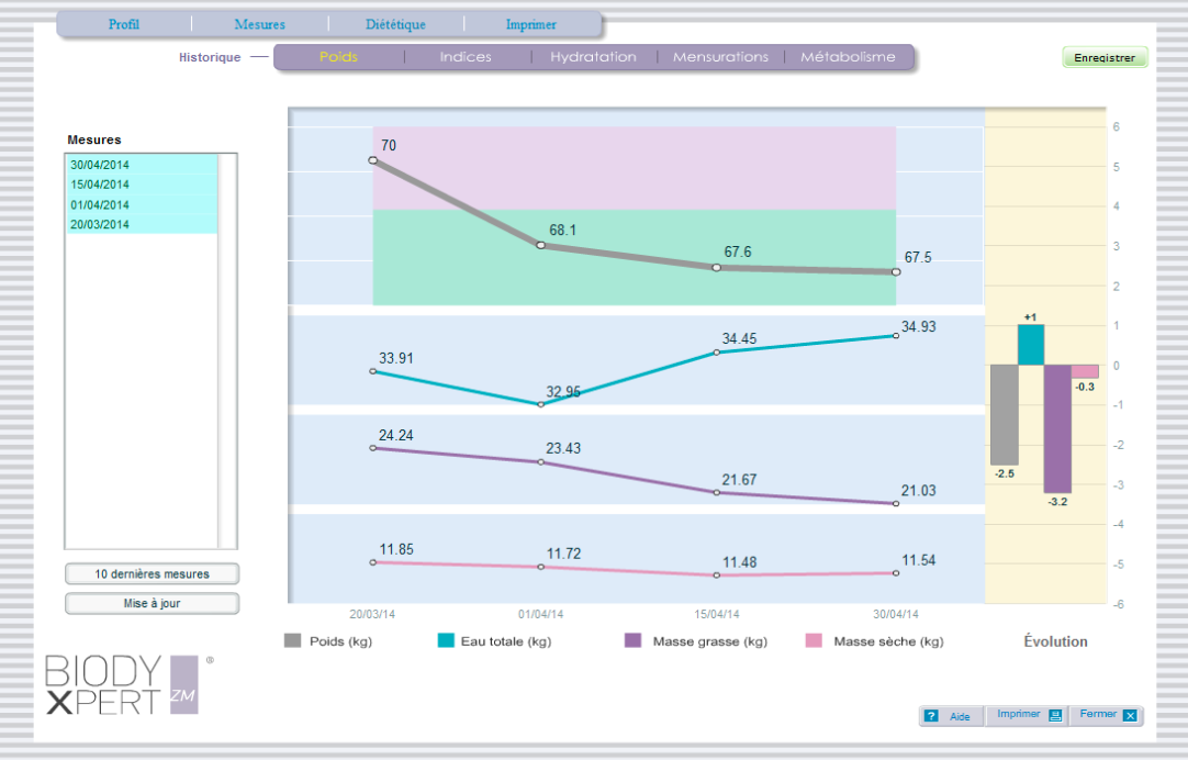 Suivez visuellement les évolutions de la composition corporelle, des mensurations, de la capacité énergétique, du métabolisme basal...