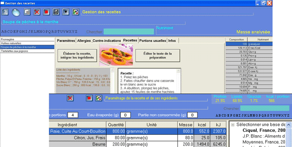 Les recettes sont intégrées dans la base alimentaire et utilisées dans la réalisation de menus manuels ou assistés par ordinateur suivant les plans alimentaires.